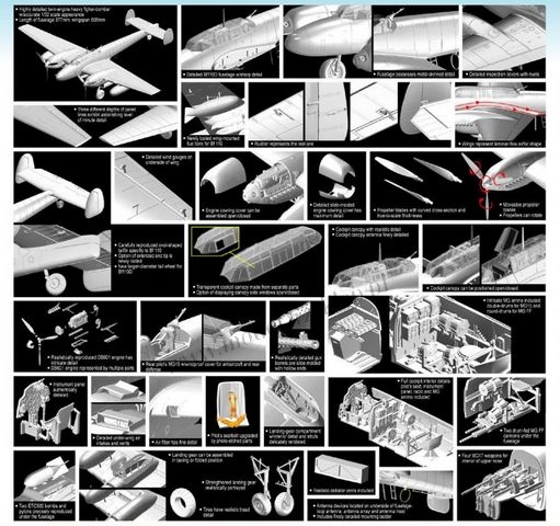 Dragon wypuścił już wcześniej nocny myśliwiec Bf110D/E 2 w 1 w serii Wing Tech w skali 1/32, a kolejnym zestawem tego słynnego niemieckiego samolotu jest identycznie skalowany Bf110D-3. Oparty na wysoko cenionych wcześniejszych modelach, ten nowy model to prawdziwy majstersztyk! Całkowicie nowe części, takie jak podwozie. Główne podwozie i koło ogonowe są zupełnie nowe, a opony posiadają precyzyjnie wyprofilowany bieżnik. Zbiorniki paliwa montowane na skrzydłach również są nowe, co zapewnia samolotowi większy zasięg. Łącząc te nowe części ze sprawdzonymi komponentami, takimi jak silnik DB601 (który jest misternie odwzorowany w wielu częściach) z poprzednich zestawów, modelarze mogą być pewni najwyższej jakości i najwyższego poziomu szczegółowości w swoim Bf110D-3 w skali 1/32… co jest normą w serii Dragon's Wing Tech!