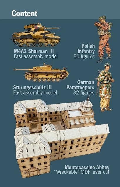 Zawiera : M4A2 Sherman III , Sturmgeshutz III , Polish infantry 50 figurek , German paratroopers 32 figurki , budynek klasztoru . Nie zawiera kleju i farb.