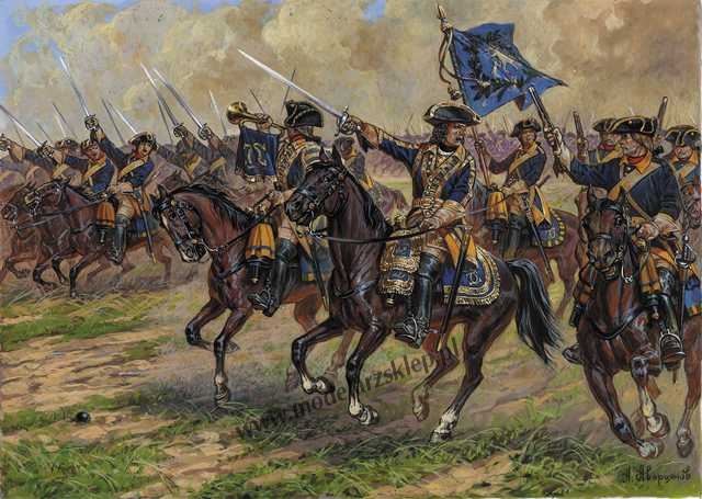 zawiera 18 figurek na koniach, w ośmiu rożnych pozach, w tym jeździec z flagą
